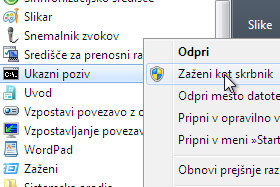 Kliknite na Start, Vsi programi, Pripomočki in kliknite z desnim miškinim gumbom na Ukazni poziv.