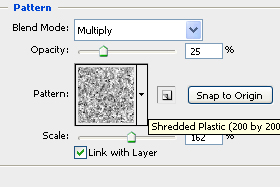 Pri Pattern Overlay uporabite Pattern imenovan Shredded Plastic, ki je v Texture Fill 2. Prepišite tudi ostale podatke s slike.