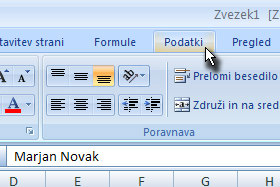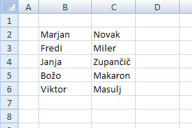 V tem primeru bomo ime in priimek, ki se nahajata skupaj v eni celici, razdelili na dva dela.