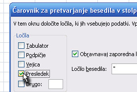 Ker je ločilo v tem primeru presledek, označite zato Presledek in kliknite na gumb Naprej.