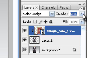 ![]() Določite sedaj layerju senčenje na Color Dodge in Opacity na okoli 65% (glej sliko). |
