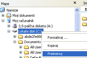 Obstaja pa tudi še lažji način za preimenovanje in sicer, da v Raziskovalcu z desnim miškinim gumbom kliknete na vaš trdi disk in izberete opcijo Preimenuj.