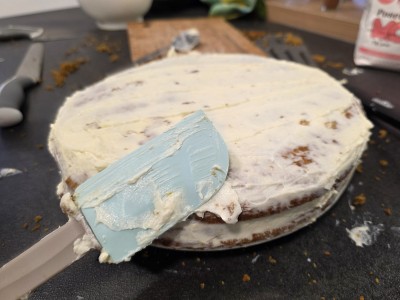 Pecivo razdelite na dve ali tri nadstropja in namazite glazuro med nadstropji in pazite, da vam jo bo nekaj ostalo tudi za zgornji del. |