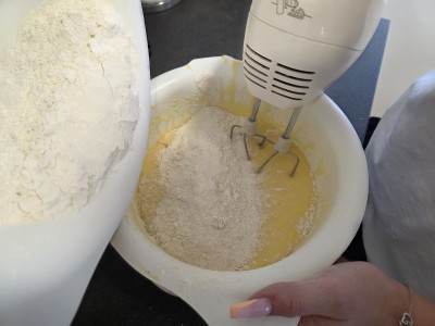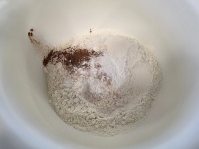 V drugo posodo dodajte 400 gramov moke, 1 mala žličko cimeta in 1 pecilni prašek. Premešajte vse skupaj. |