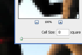 V novem oknu določite Cell Size na 8 square. Lahko se z vrednostjo square tudi malo poigrate. V mojem primeru ima fotografija dimenzije 1024 x 768 pik. Kliknite na gumb OK. |