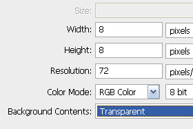 Kliknite zgoraj na File in izberite New... V novem oknu določite Width in Height tolikšen, kolikor ste določili Cell Size v prejšnjem koraku. V mojem primeru je to 8. Background Contents določite Transparent in kliknite na gumb OK. |