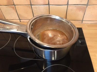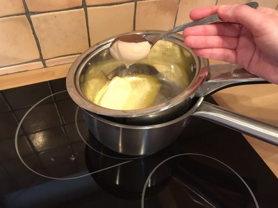 Pripravite vodno kopel. Vodna kopel pomeni, da v spodnjem loncu zavrete vodo, potem pa čez postavite novi lonec, kjer boste dodajali sestavine. Potem pa v zgornji lonec dajte 150g masla in eno žlico lešnikovega namaza, ki ste ga dobili v 400g lončku.