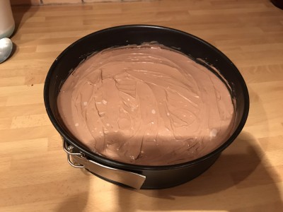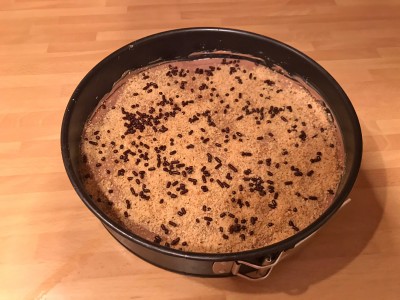Maso enakomerno porazdelite po pekaču in jo z žlico čvrsto stisnite ob dno pekača, saj bo služila za dno torte. Masa mora biti čim bolj trda. |