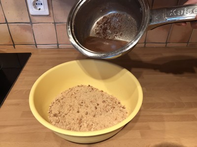 V to posodo z zdrobljenimi keksi dodajte prej pripravljeno stopljeno maslo z lešnikovim namazom. |