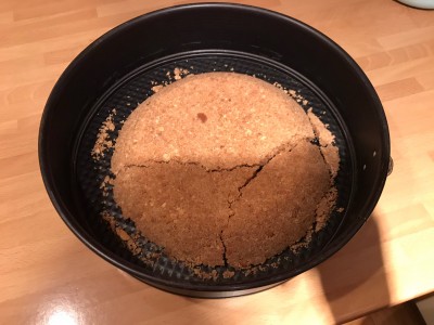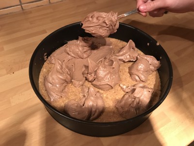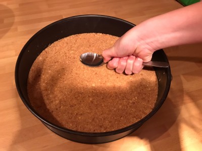 Pripravite pekač za torto, v katerega najprej stresite maso iz zdrobljenih keksov iz hladilnika. |