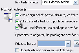 Pri polju možnosti koledarja označite še Pokaži številke tednov v pogledu meseca in datumskem krmarju.
