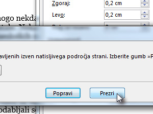 ![]() Microsoft Word vas bo opozoril, da je en ali več robov nastavljenih izven natisljivega področja strani. Kliknite na gumb Prezri. |