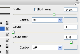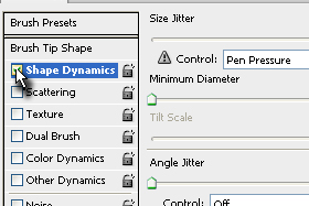 V istem oknu obkljukamo Shape Dynamics Ter določimo vrednosti Size Jitter na 100%