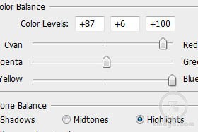 Tone Balance nastavite na Highlights, in Color Balance: Cyan: +87, Magenta: +6 in Yellow: +100. |