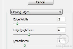 Kliknite na Stylize, in izberite Glowing Edges. Edge Width nastavite na 2, Brightness na 6 in Smoothness na 4. |