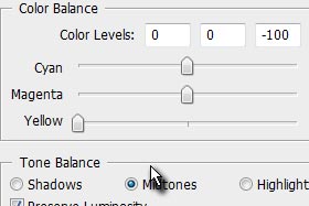 Nastavite najprej Tone balance na Midtones in nastavite Cyan in Magenta na 0, Yellow pa na -100. Zdaj nastavite Tone balance na Shadows in nastavite Yellow na -100, ostalo pa poljubno, jas sem nastavil Cyan in Magenta na +84. |