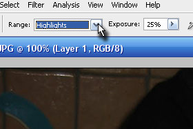 Zgoraj v orodni vrstici določite Range na Higlights in Exposure na okoli 25% (glej sliko).