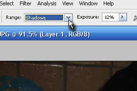 Zgoraj v orodni vrstici določite Range na Shadows in Exposure na okoli 12% (glej sliko).