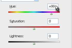 ![]() Sedaj pritisnite tipki Ctrl+U, da se vam odpre okno Hue/Saturation in nastavite Hue na +99. |