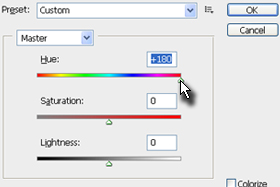 ![]() Sedaj pritisnite tipki Ctrl+U, da se vam odpre okno Hue/Saturation in nastavite Hue na +180. |