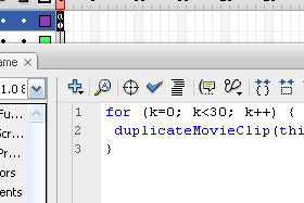 Pritisnite tipko F9 in v novo okno vpišite naslednjo kodo: for (k=0; k<30; k++) { duplicateMovieClip(this.heart, "heart"+k, k); } |