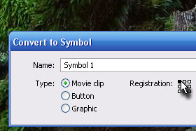 Pritisnite tipko F8 in v novem oknu Type določite Movie clip in Registration označite levi zgornji kot (glej sliko). Kliknite na gumb OK. |