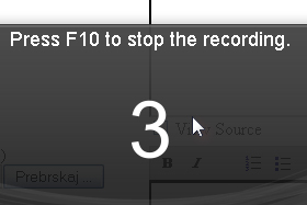 Sedaj imate na voljo 3 sekunde časa do začetka snemanja. Zgoraj vam napiše, da ko želite končati, kliknite gumb F10.