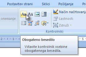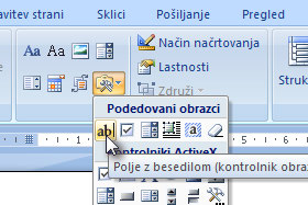 Če pa bi radi vstavljali polja, ki so vam bila znana v prejšnji različici Worda, pa lahko namesto obogatenega besedila uporabite polja z besedilom (glej sliko).