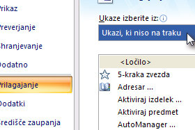 Potem pa kliknite na Prilagajanje in nato Ukaze izberite iz preko izbirnika določite Ukazi, ki niso na traku (glej sliko).