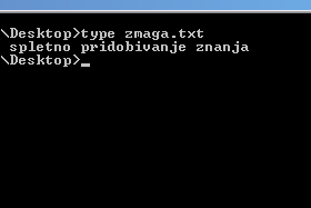Ko delate v Command Prompt morate VEDNO poleg imena datoteke napisati še končnico. Torej tukaj bo .txt V oknu se vam bo izpisalo to kar je napisano v datoteki. Primer: type zmaga.txt |