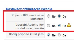 Na desni strani izberite "Prijazni URL naslovi za iskalnike" na Da.