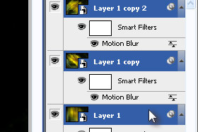 Sedaj pa držite tipko Ctrl in z miško označite vse tri duplicirane layerje z pametnimi filtri (glej sliko).