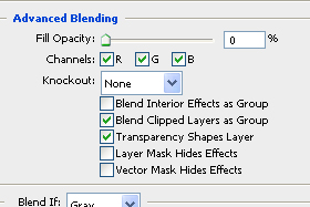 V Blending Options(najvišji gumbek) spremenite samo Fill Opacity, kot prikazuje slika.
