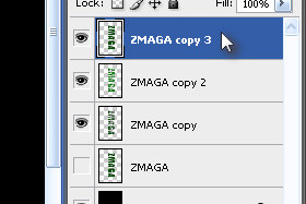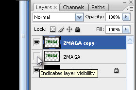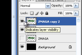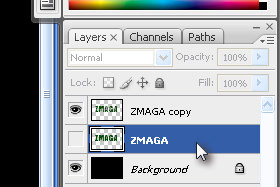 Pritisnite tipki Ctrl + J, da duplicirate tekstovni layer. Potem pa z miško kliknite na ikono z očesom, ki predstavlja prvotni tekstovni layer (glej sliko). Dupliciran tekstovni layer naj ostane označen. |