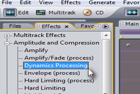 Ko imate označen celoten posnetek kliknite na efekte in izberite Dynamics Processing med Amplitude and Compression.