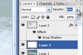 Potem pa pritisnite tipki Ctrl + Del, da zapolnete ozančeni del z belo barvo. Potem pa nastavite layerju Opacity na okoli 40% (glej sliko). |