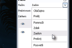 Z desnim klikom kliknite na zadnjo plast in izberite Spoj s spodnjim, način spremenite na Zaslon. To ponovite tolikokrat, da vam ostane samo še Nova plast in plast Ozadje.