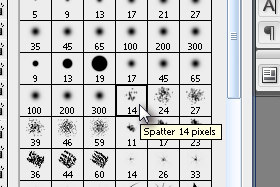 V oknu z čopiči nato izberite čopič z imenom Spatter 14 pixels. |