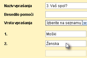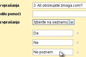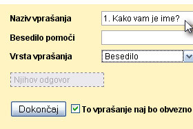 V novem oknu postavite vprašanje in spodaj v polja z možnimi odgovori napišite odgovore (glej sliko).