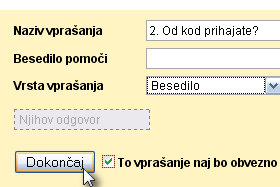 Potrdite spremembe s klikom na gumb Dokončaj. To vprašanje naj bo obvezno pomeni, da bo moral anketiranec obvezno odgovoriti na vprašanje in ga ne bo možno izpustiti. |