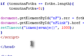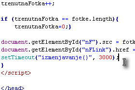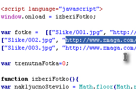<html> <head> <script language="javascript"> window.onload = izberiFotko; var fotke = [["Slike/001.jpg", "http://www.zmaga.com"], ["Slike/002.jpg", "http://www.zmaga.com/forum.php"], ["Slike/003.jpg", "http://www.zmaga.com/sodeluj.php"]]; var trenutnaFotka=0; function izberiFotko(){ var nakljucnoStevilo = Math.floor(Math.random()*fotke.length); document.getElementById("nF").src = fotke[nakljucnoStevilo][0]; document.getElementById("nFLink").href = fotke[nakljucnoStevilo][1]; izmenjavanje(); } function izmenjavanje(){ trenutnaFotka++; if (trenutnaFotka == fotke.length){ trenutnaFotka=0;} document.getElementById("nF").src = fotke[trenutnaFotka][0]; document.getElementById("nFLink").href = fotke[trenutnaFotka][1]; setTimeout("izmenjavanje()", 1000); } </script> </head> <body> <a id="nFLink"><img id="nF"></img></a> </body> </html> |
