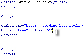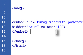 <embed src="tukaj vstavite povezavo do spletne strani" autostart="true" loop="true" hidden="true" volume="10"> </embed> |