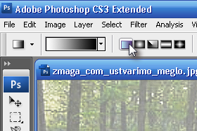 Izberite orodje Gradient Tool ter nastavite enake vrednosti v zgornji opravilni vrstici. Mode nastavite na Normal, Opacity pa na 100%.