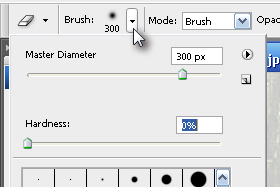 Master Diameter nastavite na 300 px, Hardness pa na 0%.
