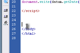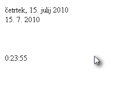 <script language="javascript"> var meseci = new Array("januar", "februar", "marec", "april", "maj", "junij", "julij", "avgust", "september", "oktober", "november", "december"); var dnevi = new Array("nedelja", "ponedeljek", "torek", "sreda", "cetrtek", "petek", "sobota"); var datum = new Date(); document.write(dnevi[datum.getDay()] + ", " + datum.getDate() + ". " + meseci[datum.getMonth()] + " " + datum.getFullYear()); document.write("<br>"); document.write(datum.getDate() + ". "+ (datum.getMonth()+1) + ". " + datum.getFullYear()); </script> Vnesli smo Javascript kodo za datum. |