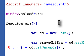 <script language="javascript"> window.onload=ura; function ura(){ var cd = new Date(); var pravaOblika = cd.getHours() + ":" + ((cd.getMinutes() <10) ? 0 : "") + cd.getMinutes() + ":" + ((cd.getSeconds() <10) ? 0 : "") + cd.getSeconds() ; document.getElementById("ura").innerHTML = pravaOblika; setTimeout("ura()", 1000); } ura(); </script> Sedaj smo vnesli še Javascript kodo za uro. |