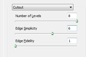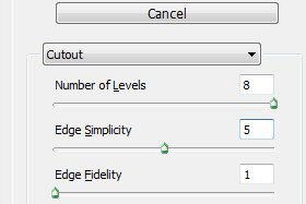 Kliknite zgoraj na Filter, Artistic in izberite Cutout... Potem pa Number of Levels nastavite 8, Edge Simplicity 6 in Edge Fidelity 1. Kliknite na gumb OK. |