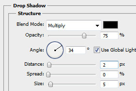 Kliknite zgoraj na Layer, Layer Style in izebrite Drop Shadow... V novem oknu se poigrajte z nastavitvami, zlasti opacity, Angle in Distance dokler ne boste zadovoljni. Kliknite na gumb OK. |