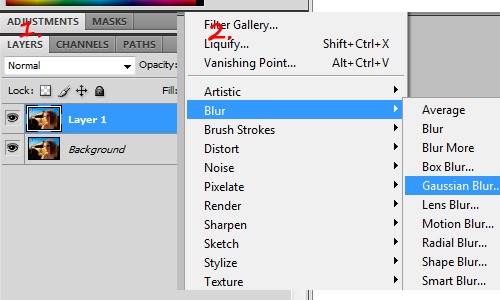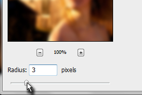 Podvojite layer (CTRL+J) in na zgornjemu layerju uporabite efekt Blur, Gaussian Blur. Radius nastavite na 3 piksle (oz. po želji).