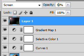 Blending mode nastavite na Screen, Opacity pa na 50%.